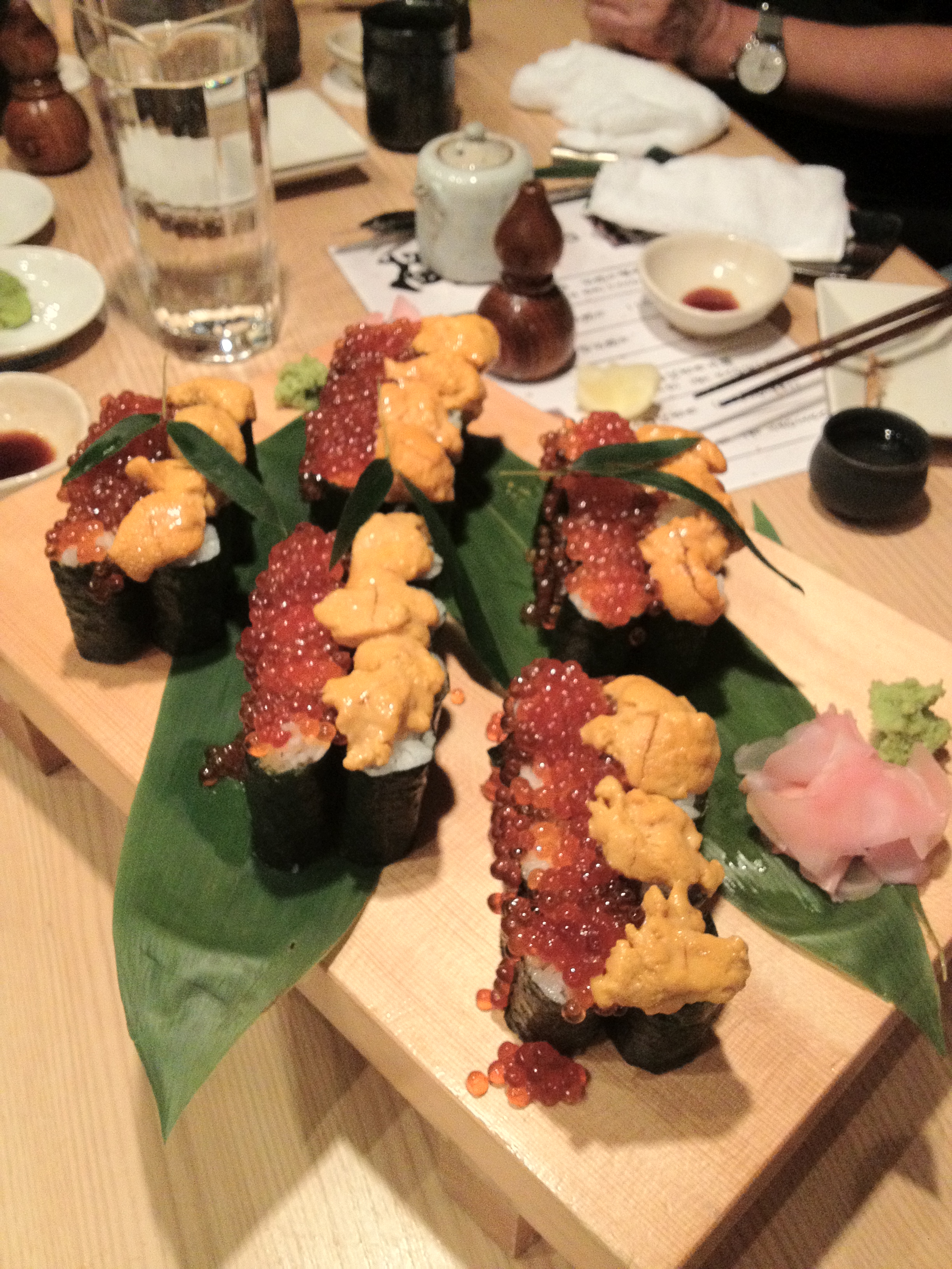 Sushi with a dual topping of Sea urchin – the yellowish stuff on the right – and salmon roe (the orange balls).