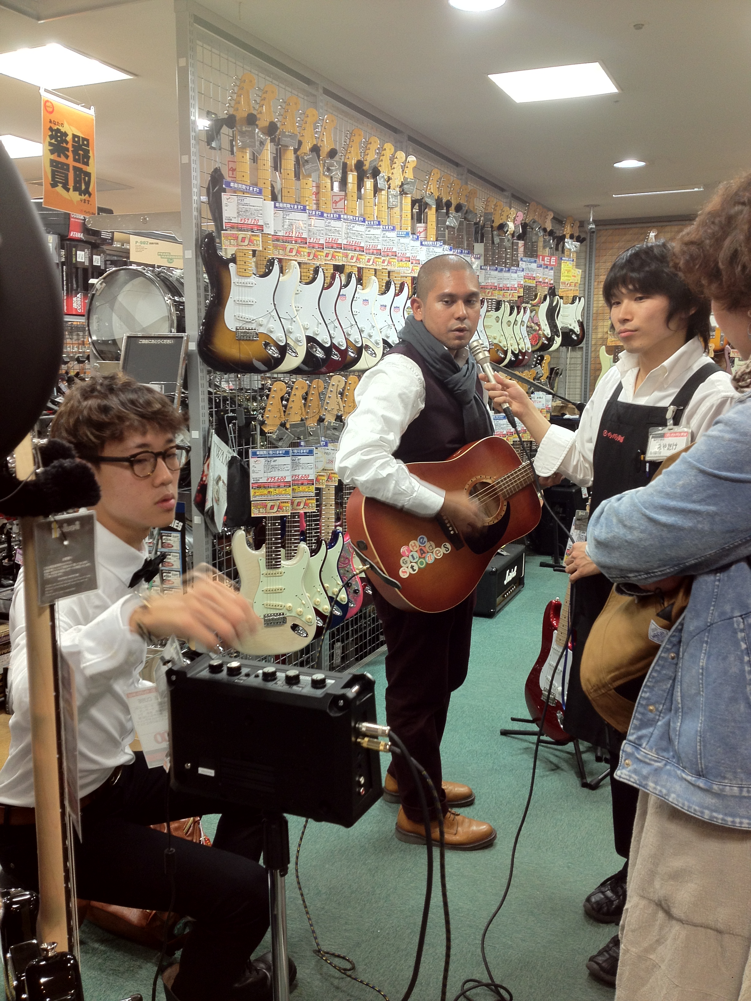 But before leaving for Osaka, I had to get a portable battery-powered amp for the performance. The good thing about Japan is that music stores are large and well-stocked. I found a decent Roland at the Ishibashi store in Kobe. That’s me trying out the guitar and mic functions. Cost: about S$200.