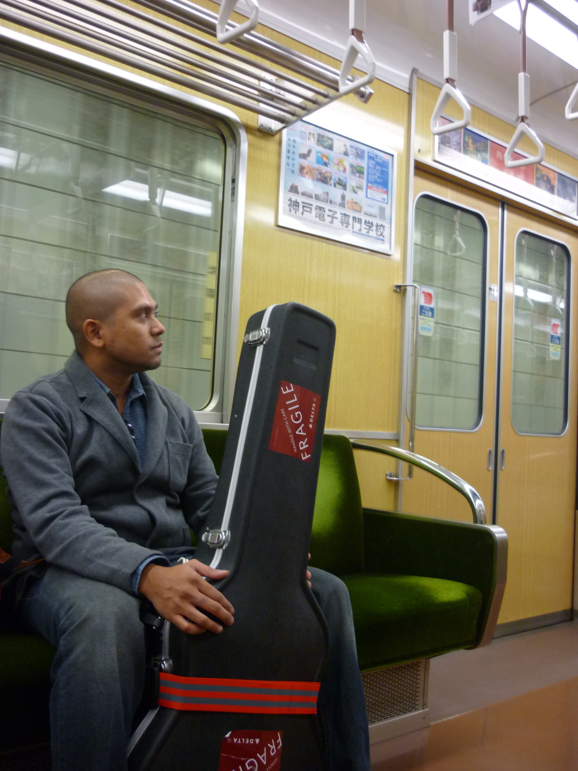 From the Shinkansen, we changed to a local line bound for Sannomiya, the biggest downtown area in Kobe, where two of our live gigs would be. This is me on the regular train, acting emo:
