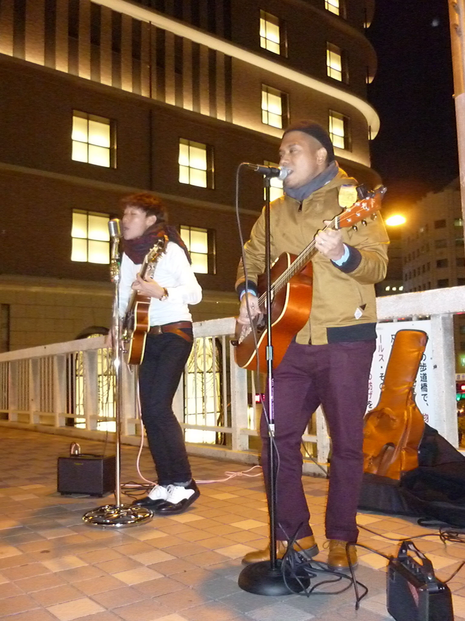 Busking night, and there were performers literally at every corner outside Osaka station. So we decided our first spot would be on a link bridge above the bustling traffic. It was freezing out there in the open, but we gave it our all. At the end of our set, Jaye’s friend Marina – who’s a trained opera singer – jammed with us. The moment when acoustic folk music met classical opera, was awesome.